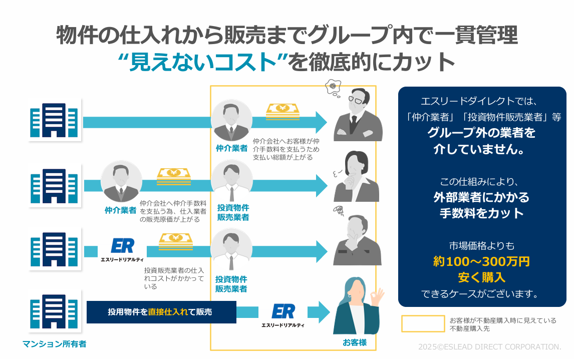 そこで誕生したのが、エスリードダイレクトです。エスリードグループが自社で開発・保有し、管理を行っている物件を、仲介業者を介さずに投資家へ直接届ける仕組みです。外部のマージンや仲介手数料を排除することで、適正価格での購入を実現しています。